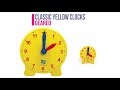 This classic geared yellow clock is designed to teach how to read an analog clock. This clock has a blue minute hand and red hour hand with matching font colors for clarification. Teacher clock is 12.8" and student clock is 4". Contains 6 student clocks (4"). Grades K+. Teacher size shown in image not included.